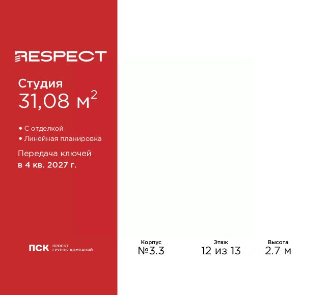 Однокомнатная квартира-студия с предчистовой отделкой в ЖК "RESPECT" на 4 этаже. Общая площадь: 23.51 кв.м., площадь гостиной 14.02 кв.м., из которых 5 кв.м. выделено под кухонную зону. Все окна выходят на одну сторону. В квартире один балкон, один совмещенный санузел. Высота потолков 2.7 м. Квартира будет сдана с отделкой WHITE BOX, в которую включены следующие виды работ: - заливка стяжки; - установлена система отопления квартиры; - подготовлены потолки; - все стены выровнены, загрунтованы и отштукатурены; - электрическая проводка разведена по комнатам. Квартира будет готова к чистовой отделке. Дом монолитный, многоподъездный, переменной этажности, от 10 до 13 этажей. Квартира находится в 1-й секции высотой 13 этажей в корпусе 3.2. На этаже 5 квартир. В подъезде 1 пассажирский и 1 грузовой лифт. Начало строительства - 3 квартал 2025 года. Окончание строительства - 4 квартал 2027 года. Оформление сделки по договору долевого участия. В шаговой доступности от жилого комплекса находятся станции метро (расстояние по прямой): "Лесная" (800 м), "Площадь Мужества" (1.4 км), "Выборгская" (1.9 км), также недалеко от этого корпуса находятся станции метро: "Академическая", "Политехническая". Жилой квартал "RESPECT" строится на Полюстровском пр, 87, в одной из самых востребованных локаций Петербурга. В 10 минутах пешком - метро "Лесная" и в 10 минутах на транспорте - Петроградская сторона. Высота домов от 7 до 13 этажей. Квартиры сдаются с отделкой white box и с чистовой отделкой. На территории Respect строится школа на 1125 учащихся и детский сад на 240 мест. Запроектированы собственная газовая котельная, закрытая территория, дворы без машин и подземные паркинги с лифтами. В проекте предусмотрены трапециевидные балконы или остекленные лоджии, которые, с одной стороны, исключают монотонность фасада, являясь декоративными элементами, с другой дополнительным функциональным пространством в квартирах. Цветовая гармония фасадов каждого дома раскрывает характер квартала. Коричневый цвет клинкерного кирпича со структурой водяных штрихов — цвет уюта и безопасности, сдержанности и надёжности. Вентилируемые фасады облицованы клинкерным кирпичом. Его высокая прочность позволяет давать 100 лет гарантии на этот материал. Водопоглощение клинкерного кирпича составляет менее 5%, за счет чего у него высокая теплопроводность и прочность. В квартале запроектированы внутренние закрытые территории дворов домов без доступа автомобилей и безбарьерная среда для велосипедистов и колясок. Предусмотрены IP-домофония с функцией дистанционного открывания калиток и парадных, а также дистанционный сбор показаний счетчиков и мобильное приложение для жителей. Для безопасности жителей квартала - круглосуточное видеонаблюдение и служба охраны. В каждой квартире предусмотрены внешние корзины для кондиционеров. Вся территория квартала будет связана единой концепцией благоустройства, разработанной ландшафтным бюро L.BURO. На эксплуатируемой кровле на уровне первого этажа Продам квартиру-студию в новостройке в округе Пискарёвка в Санкт-Петербурге.