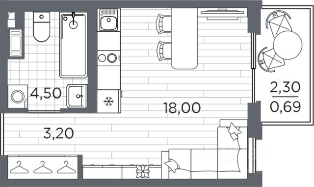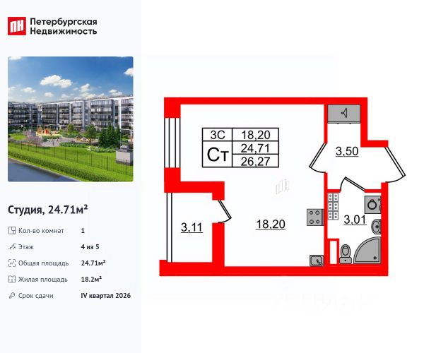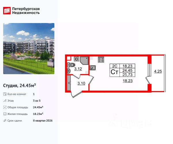 Квартира - 24,76 кв.м (жилая 18,02кв.м, балкон 5,02 кв.м, с/у 3,37кв.м 2 этаж из 5. С рассрочкой платежа до 30.09.2028 года, срок сдачи IV кв. 2028 года,