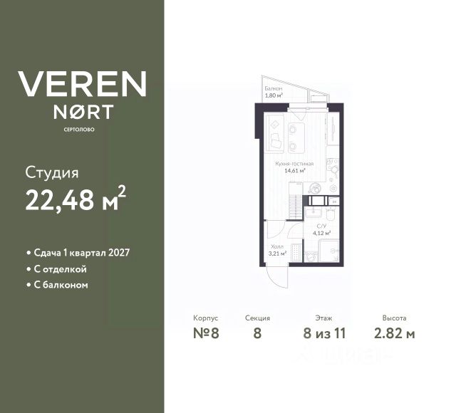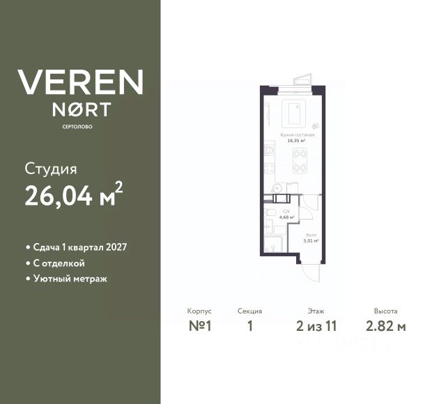 Продаётся студия в строящемся доме (Корпус 8.2), срок сдачи: IV-кв. 2025, общей площадью 25.19 кв.м., на 4 этаже. ЖК расположен в Сертолово, мкр.Черная речка. 25 минут на машине до метро Парнас, либо 30 минут до метро Пр.Просвещения. 1 ноября 2022 г. объявлен старт продаж, а значит именно сейчас самые привлекательные цены. Проектное финансирование строительства осуществляет ПАО "Сбербанк". Объект аккредитован по ипотеке в ведущих банках, есть выгодные варианты рассрочки от застройщика, принимается мат.капитал. ЖК "Новая история" это новый малоэтажный жилой комплекс, имеющий свой неповторимый стиль. КОНКУРЕНТНЫЕ ПРЕИМУЩЕСТВА ЖК "НОВАЯ ИСТОРИЯ" 1. Технология строительства кирпично-монолитные дома. 2. Привлекательные современные фасадные решения. 3. Просторные остекленные балконы/лоджии почти в каждой квартире. 4. Закрытые дворы. Посадка жилых домов сформирована таким образом, что каждые 2 дома объединяются общим дворовым пространством, которое огораживается забором. 5. Видеонаблюдение в каждом доме и каждом дворе. Система видеонаблюдения, которой каждый покупатель может пользоваться в своем мобильном телефоне через специальное приложение. 6. Грузопассажирские двухсторонние лифты в каждом подъезде. Т.е. лифт поднимает с уровня земли на каждый этаж. Таким образом, решается вопрос с обеспечением доступа маломобильных групп населения, а также удобен для всех остальных жильцов. Нет необходимости в различных пандусах, чтобы попасть в дом или на первый этаж. 7. Колясочные в каждом подъезде. 8. Комфортная высота потолков от 2,75 до 3 м. 9. Горизонтальная система теплоснабжения (трубы отопления в квартире проходят в стяжке пола и подводятся к радиаторам), а также "безстояковая" система водоснабжения в квартирах (водорозетки устанавливаются на стене, граничащей с общим коридором, под потолком) 10. Многообразие и продуманность планировочных решений. 11. Бесплатные wi-fi зоны во дворах. 12. Велопарковки. 13. Бачки для раздельного сбора мусора. 14. Спам-контейнеры в подъездах. 15. Интернет заведен в каждую квартиру. 16. Розетки на парковках для зарядки электромобилей. 17. В каждой квартире установлен видеофон. 18. Прогулочные зоны. 19. Индивидуальная система естественной вентиляции немецкого бренда Schiedel (для каждой квартиры свой вент.канал, не соприкасающийся с другими, т.е. запахи не будут попадать из квартиры в квартиру). 20. Система "умная инженерия" в каждой квартире: -Счетчики потребления тепловой энергии для каждой квартиры с дистанционным снятием показаний (жильцы платят только за реальных расход тепла, которое они потребили) - термоголовка на каждом радиаторе (регулирует тепло в квартире, позволяет существенно экономить на теплоснабжении); - электронные датчики протечки воды и электронный механизм для запирания (отправляет сигнал о протечке в мобильное приложение, а также сразу в управляющую компанию, перекрывает воду в месте установки крана); - счетчики на воду с дистанционным снятием показаний, передающие показания автоматически в управляющую Купить квартиру-студию от застройщика в Сертолово.