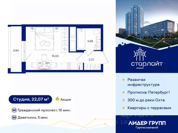 Продаётся студия в ЖК "Большая Охта" на 7 этаже. Общая площадь составляет 20.60 кв. м. Квартира с white box отделкой. Жилой комплекс "Большая Охта" располагается по адресу Санкт-Петербург, Красногвардейский. "ЛСР. Большая Охта" - проект бизнес-класса, в Красногвардейском районе между Якорной и Партизанской улицами, рядом с центром Петербурга. Престижный комплекс с удобной пешеходной и транспортной доступностью. Особенности квартиры высокие потолки и увеличенные окна. Горизонтальная разводка труб водоснабжения и отопления и вынесенные в холлы счетчики сохранят эстетичный дизайн комнат. Встроенные клапаны инфильтрации воздуха будут поддерживать чистоту и свежесть воздуха. Расположение: • 8 мин на авто до станции метро "Новочеркасская"; • 10 мин на авто до станции метро "Ладожская"; • 10 мин на авто до Таврического сада и исторического центра города; • 13 мин на авто до станции метро "Чернышевская"; • 25 мин на авто до КАД. Пространство внутри комплекса разделено на функциональные зоны: тематические, спортивные, уединенные. Все площадки окружают взрослые хвойные и лиственные деревья, подобранные с учетом роста, эстетики и сезонного цветения. Расширенная инфраструктура комплекса продумана до мелочей. Внутри квартала есть все необходимое для жизни с комфортом и удовольствием - детские сады и школы, магазины, площадки для спорта и отдыха, фитнес-залы, модные кофейни и общественные летние веранды. Преимущества: • Подземный паркинг и кладовые помещения; • Двор без машин; • Система "Умный дом" (в т.ч. управление домофоном со смартфона); • Пост охраны и консьерж; • Индивидуальный тепловой пункт; • Колясочные в каждой парадной; • Зарядка для электромобилей. Успейте приобрести квартиру на выгодных условиях! Чтобы узнать подробности, обращайтесь за консультацией по телефону. Купить квартиру-студию от застройщика в районе Красногвардейский в Санкт-Петербурге.