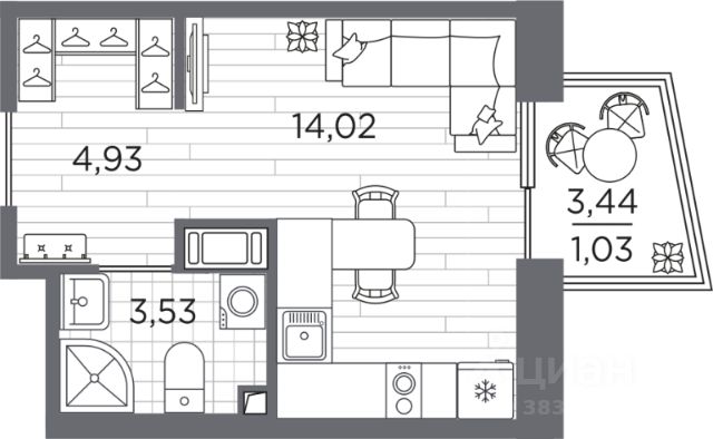 Квартира находится в 22 этажном доме, в Корпус 3 на 9 этаже. Общая площадь квартиры 25,50 кв.м.