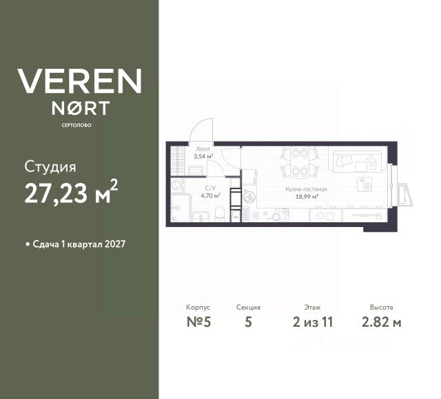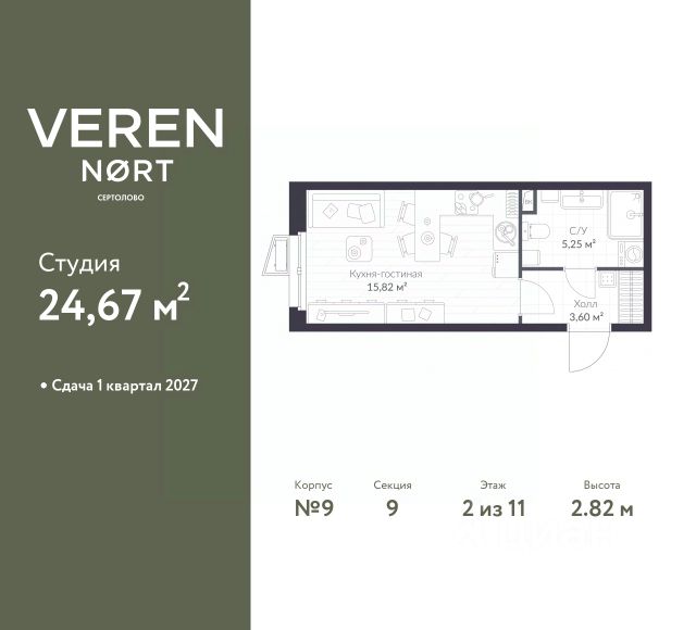 Торопитесь забронировать на этих условиях! Срок акции ограничен! Стоимость квартиры указана со скидкой, ваша экономия составит 435,212 RUB. Звоните, наши менеджеры вам все расскажут! 1-комн. квартира-студия в Veren Nort Сертолово на 3 этаже. Квартира без отделки, после получения ключей можно делать ремонт. Общая площадь: 24.01 кв.м., площадь гостиной 15.79 кв.м., из которых 5 кв.м. выделено под кухонную зону. Все окна выходят на одну сторону. В квартире один совмещенный санузел. Высота потолков 2.82 м. Квартира находится в корпусе 5. Дом монолитный, одноподъездный, высотой 11 этажей. На этаже 14 квартир. В подъезде 1 пассажирский и 1 грузовой лифт. Окончание строительства - 1 квартал 2027 года. Оформление сделки по договору долевого участия. Вид на приватный двор. Сочетание современной архитектуры и отличной экологии севера Лен. области. Выразительный облик домов разработан именитым архитектурным бюро "Остоженка". Характеристики жилого комплекса исключительны: продуманный ландшафтный дизайн, оригинальные парадные, разработанные по индивидуальному дизайн-проекту, современные детские и многофункциональные спортивные площадки, летний кинотеатр под открытым небом, два детских сада. Комплекс создается в уже сложившейся инфраструктуре г. Сертолово и обладает удобным транспортным сообщением с Санкт-Петербургом. В 300 метрах от "VEREN NORT сертолово" планируется транспортно-пересадочный узел "Сертолово", который обеспечит удобную железнодорожную связь с Финляндским вокзалом Санкт-Петербурга. #zWEWgu Купить квартиру-студию от застройщика рядом с метро Проспект Просвещения.
