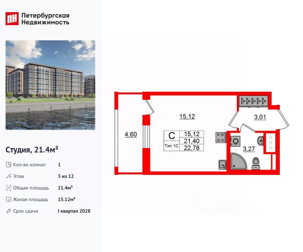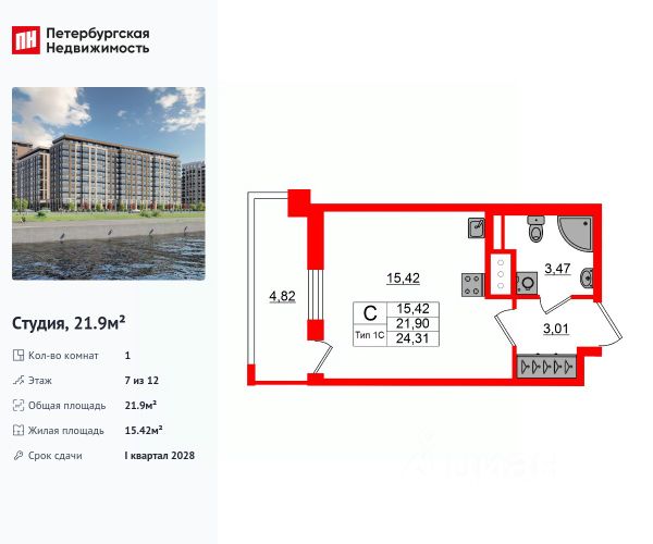 Продается уютная студия от застройщика в жилом комплексе "Сэтл Ривьера" в активно развивающимся Невском районе. До метро можно добраться на транспорте всего за 10 минут. Удобная, классическая, функциональная европланировка, вместительная прихожая 3.01 м². Общая площадь студии - 21.9 м², жилая 15.42 м², высота потолка 2.77 м. Квартира продается с отделкой "Норд Лайн светлый плюс". Что особенного в ЖК "Сэтл Ривьера"? • Первая береговая линия Невы. 5 км до центра Петербурга • "Активити парк" - пространство для занятий спортом и отдыха. "Ривьера парк" с променадом и панорамной ротондой • Масштабные дворы 10 000 кв.м. с авторским ландшафтным дизайном • Двухуровневые единые входные группы • Видовые квартиры с террасами, каминами и саунами Продается квартира-студия от застройщика на набережной Октябрьская в Санкт-Петербурге.