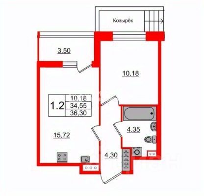 Общая площадь составляет 33.36 кв. м. застекленная лоджия 3.38 кв.м.