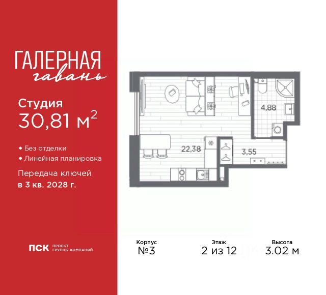 Продается 1-комн. квартира-студия от застройщика в ЖК "Галерная гавань" на 2 этаже. Квартира без отделки, после получения ключей можно делать ремонт. Общая площадь: 30.81 кв.м., площадь гостиной 22.38 кв.м., из которых 5 кв.м. выделено под кухонную зону. Все окна выходят на одну сторону. В квартире один совмещенный санузел. Высота потолков 3.02 м.
