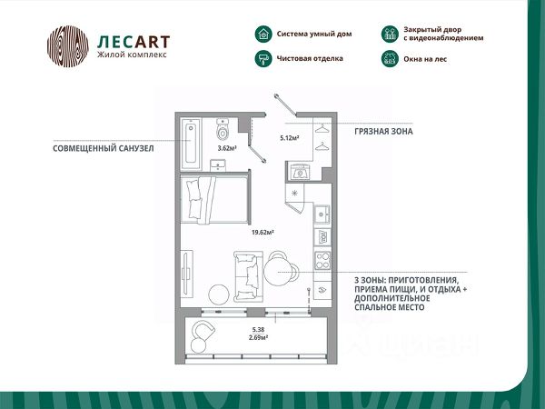 Дом сдан Продаётся студия квартира 555, общей площадью 25.79 кв.м., на 4 этаже. Дом комфорт-класса, 12 этажей, в окружении леса и малоэтажной застройки. Проект с умным домом. Дом сдан. РАСПОЛОЖЕНИЕ И БЛАГОУСТРОЙСТВО Расположение ЖК "ЛесART" порадует любителей чистого воздуха — рядом находятся лесопитомник и Шунгеровский заказник. Особенность комплекса это его ART дворы, которые оформлены по мотивам произведений Василия Кандинского, Пита Мондриана и Пабло Пикассо. Дворы закрыты от машин, что обеспечивает безопасность детей и взрослых. Для семей с детьми особенно удобно наличие детского сада и школы прямо во дворе комплекса. На первом этаже расположены магазины, маркетплейсы, кофейни и всё что необходимо для повседневной жизни. Холлы - это продуманные пространства с колясочными, сквозными проходами и приятной музыкой в лифтах. СИСТЕМА УМНОГО ДОМА В КАЖДОЙ КВАРТИРЕ - Комфорт. Управление освещением, мультимедиа и климат-контролем. - Безопасность. Видеонаблюдение и мониторинг систем безопасности. - Экономия. Контроль систем и оптимизация энергопотребления. - Удобство. Управление с помощью мобильного телефона. ГК "ЕДИНО" Входит в тройку компаний-лидеров региона по потребительским качествам жилых комплексов, объемам ввода жилья и объемам текущего строительства. В цифрах: - 23 года на рынке - Более 50 построенных домов - 60 000+ счастливых обладателей квартир ЗАПИСЫВАЙТЕ НА ПРОСМОТР! Мы ждем Вас в нашем уютном шоуруме. Вы увидите отделку, дизайнерские решения и познакомитесь со сценариями Умного дома! Такси до офиса продаж и обратно БЕСПЛАТНО! Продам квартиру-студию с отделкой в Ломоносовском районе Ленинградской области.