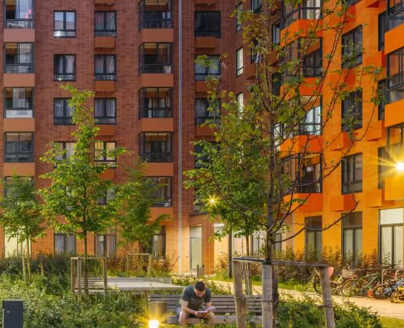 В состав жилого комплекса "Ювента" входит три здания комфорт-класса высотой 6, 9 и 11 этажей с яркими разноцветными фасадами, а также пристроенный корпус детского сада на 80 малышей.