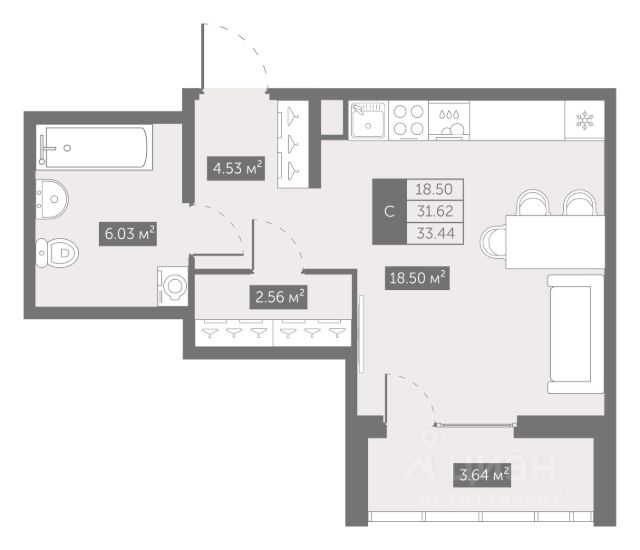 Комната 18.92 кв. м. , прихожая 3.04 кв. м. , санузел 3 кв. м.,