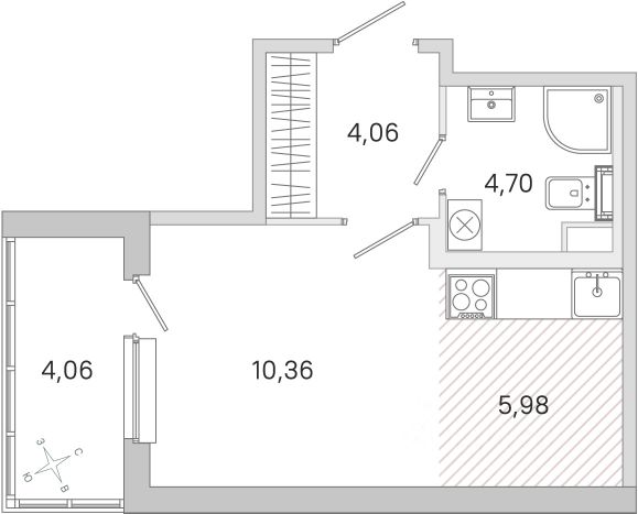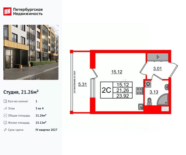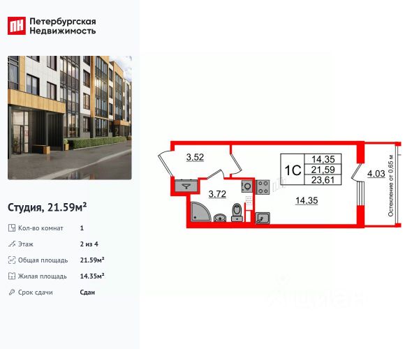 Площадь квартиры 18.20 + балкон 3.60 кв.м. в Шушарах, в развитом и престижном районе СПб