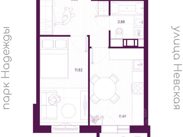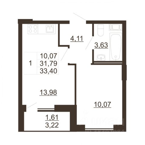 Жилая площадь 23.8 м2, кухня 18.25 м2. Площадь комнат: 11.73/12.07 м2, балконов - 1, окна выходят во двор и на улицу.
