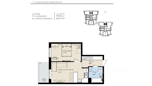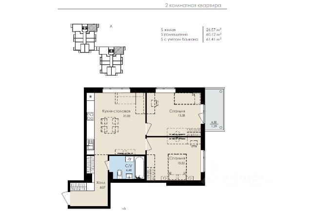 Жилая площадь 24.49 м2, кухня 12.9 м2. Площадь комнат: 12.3/12.19 м2. Раздельных санузлов - 1, балконов - 1, окна выходят на улицу.