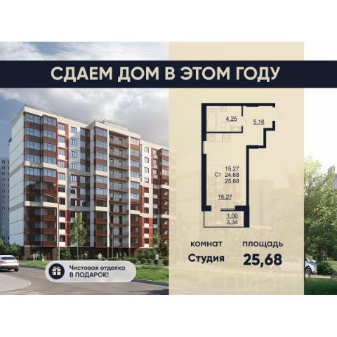 Прямая продажа от застройщика. Отделка White box в подарок! ЖК "Ермак" современный жилой комплекс комфорт-класса на первой береговой линии Невы, рядом с Невским лесопарком. Из большинства квартир (90%) открываются захватывающие панорамные виды на реку. Комплекс спроектирован с учетом современных требований безопасности, технологичности и качества материалов. Во дворе жильцов ждет настоящий сад с разнообразными зонами отдыха для всей семьи и площадкой для выгула собак. А для автовладельцев предусмотрены 436 машино-мест на закрытой парковке. Кроме того, в комплексе расположено 20 коммерческих помещений. Квартиры: Трёхкомнатные квартиры ЖК "Ермак" обладают наилучшими видовыми характеристиками — из их окон открывается великолепный вид на Неву и набережную. Комплекс предлагает широкий выбор планировочных решений — от компактных студий (от 25,2 кв.м) до просторных трёхкомнатных квартир (до 69,9 кв.м). Удобные планировки, в том числе евроформата с объединенной кухней-гостиной, позволяют максимально эффективно использовать пространство. Квартиры сдаются с предчистовой отделкой White Box, что предоставляет будущим жильцам свободу в реализации своих дизайнерских идей. Важное преимущество подобной отделки отсутствие шумных и "грязных" работ при заселении. Инфраструктура: Во дворе жилого комплекса раскинулся настоящий зелёный оазис с разнообразными растениями — идеальное место для отдыха после пробежки или тренировки на специально оборудованных спортивных площадках. В шаговой доступности находятся Невский лесопарк и благоустроенная набережная Невы с чистой водой. Это живописное место напротив устья реки Ижоры имеет историческое значение: именно здесь князь Александр Невский разгромил шведов. А для автовладельцев предусмотрена наземная парковка по периметру квартала. Благоустройство дворов: Природа здесь не просто гость, а полноправный житель. Почти половина территории комплекса отведена под благоустройство. Тщательно подобранные деревья, цветы и кустарники создают неповторимый ландшафт, радующий глаз не меньше, чем вид на реку. Живые изгороди гармонично разделяют детские и спортивные площадки, уютные скамейки и беседки, изумрудные газоны и современные малые архитектурные формы. Для комфорта каждого члена семьи предусмотрены также площадка для выгула собак. Транспортная доступность: Близость к КАД: 7 км до КАД (8 минут на автомобиле). Метро: 20 минут езды на транспорте до станции метро "Ломоносовская". Остановки общественного транспорта рядом с комплексом. Продуманные парадные: Входные группы спроектированы для максимального комфорта жителей и их гостей, как внутри, так и снаружи. Больше свободного места в квартирах! Для хранения колясок, велосипедов и самокатов предусмотрены просторные помещения в каждой парадной. Ключевые преимущества и особенности: Близость к природе: Невский лесопарк и набережная Невы рядом с домом. Зоны отдыха для всей семьи и площадка для выгула собак. Парковка Концепция "двор без машин". Разнообразие планировок кварт Квартира-студия первичка в поселке городского типа Имени Свердлова Всеволожского района.