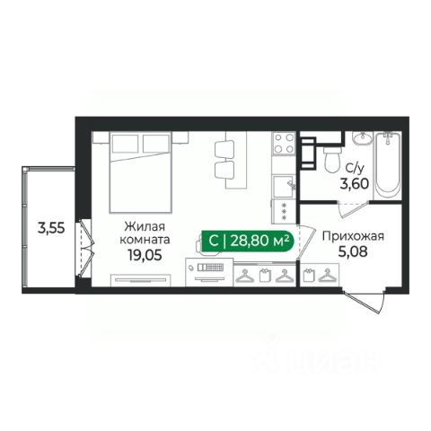 Площадь квартиры: 36,2 кв.м. + 3 кв.м балкон.