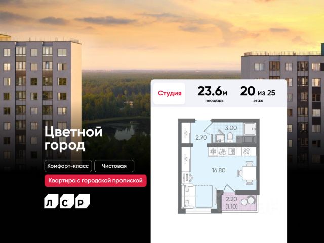 Цена действует при 100% оплате и на определенные ипотечные программы. Подробности — в отделе продаж по телефону. Продается студия в ЖК "Цветной город" на 23 этаже. Общая площадь составляет 21.40 кв. м. Квартира с чистовой отделкой Срок сдачи дома: 4 квартал 2025. Жилой комплекс "Цветной город" располагается по адресу Санкт-Петербург, Красногвардейский. "Цветной город" - современный масштабный эко-проект: жилые кварталы со своей сетью улиц, пешеходными бульварами и велодорожками, площадками для спорта и отдыха. Кварталы располагаются вдоль береговой линии реки Охты. "Цветной город" - это жизнь вблизи природы, но с городской пропиской. К 2026 году на берегах реки Охты будет создан Пейзажный парк с летними экотропами и зимними горками для тюбингов, скейт-парком и летним кинотеатром. В ЖК "Цветной город" запланировано и уже частично реализовано строительство 10 школ, 16 детских садов, 4 поликлиники, больница, ТРК, спортивно-оздоровительные сервисы С центром Петербурга жителей "Цветного города" свяжет Пискарёвский проспект, удобный выезд на КАД позволяет без труда добираться до других районов. Расположение: • 10 минут на авто до КАД; • 15 минут на авто до станций "Гражданский проспект" и "Академическая"; • 20 минут до ж/д станции "Ручьи".; Квартира сдается с готовой отделкой из современных экологичных материалов: на стенах плотные белые обои под покраску, на полу износостойкий матовый ламинат, в санузлах керамическая плитка на стенах и керамогранит на полу. Трубы отопления скрыты в стяжке пола и не мешают мебели. В квартире предусмотрено большое количество двойных розеток и выключателей. В ЖК "Цветной город" предусмотрена система "Умный дом": смартфон с приложением является ключом от всех дверей в ЖК, гостевой доступ оформляется в приложении, видеозвонки от домофона поступают в приложение, показания счетчиков автоматически передаются в учетные базы ЖКХ. Преимущества: • Рядом лесопарк и река Охта • Живописные виды из окон • Безбарьерная среда • Развитая социальная инфраструктура • Система "Умный дом" Успейте приобрести квартиру на выгодных условиях! Чтобы узнать подробности, обращайтесь за консультацией по телефону. Продам квартиру-студию первичка на дороге Муринская в Санкт-Петербурге.