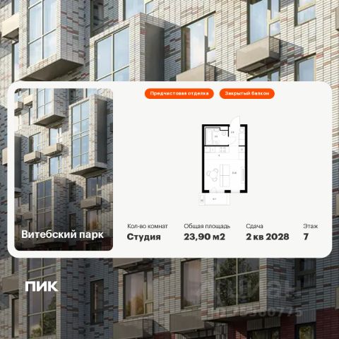 Продаётся квартира-студия площадью 23,3 кв.м на 3 этаже 12 этажного дома (Корпус 7, Секция 1) проекта ПИК Витебский парк. Светлый просторный подъезд на уровне земли, функциональная планировка, большие окна, c отделкой.