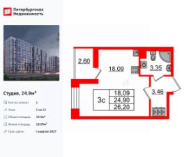 Продается просторная студия от застройщика в жилом комплексе "Бионика Заповедная" в динамичном Приморском районе. До метро можно добраться на транспорте всего за 11 минут. Удобная, классическая, функциональная европланировка, вместительная прихожая 2.8 м². Общая площадь студии - 24.73 м², жилая 18.06 м², высота потолка 2.77 м. Квартира продается с отделкой "NORD LINE WHITE ВК NEW". Что особенного в ЖК "Бионика Заповедная"? • Оазис в городе 3 минуты пешком до Новоорловского заказника (140 ГА) • Захватывающие виды из окон на хвойный лесопарк • Всесезонный "Заповедный парк" во дворе площадью 23000 кв.м. • 5 единых входных групп с авторским дизайном и лаундж-зонами, сити-виллы на первых этажах с палисадниками и высотой потолков до 4 м • Места притяжения: фонтан "Бионика", спортивный кластер со скейт-парком, фотозоны с арт-объектами Купить квартиру-студию первичка на проспекте Орлово-Денисовский в Санкт-Петербурге.
