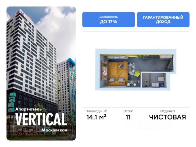 Продаются апартаменты 401, общей площадью 20.78 м2, расположенные на 4 этаже, в 2 корпусе инновационного апарт-отеля Vertical Московская. Помещение сдается с чистовой отделкой, мебелью и техникой. Vertical Московская - инновационный апарт-отель, сочетающий в себе современную недвижимость и готовый бизнес. Расположенный в самом сердце Московского района на улице Орджоникидзе. Великолепная инфраструктура близ комплекса и удобная транспортная сеть создают идеальные условия для насыщенной жизни резидентов в наших апартаментах и инвестирования. Отличная транспортная доступность: - в 3 минутах несколько остановок общественного транспорта - 15 минут пешком Метро "Московская" - 15 минут пешком метро "Звездная" - 15 минут на машине Аэропорт "Пулково" - 20 минут на машине Московский вокзал Удачное расположение: - Пулковский парк - В пешей доступности магазины Лента, Окей - 20 минут на машине Петергоф - 20 минут на Машине Московский вокзал Преимущества: - Встроенная система "умный дом" - Мобильное приложение гостя и многофункциональный личный кабинет инвестора - Современные системы безопасности Продается квартира-студия первичка на улице Орджоникидзе в Санкт-Петербурге.