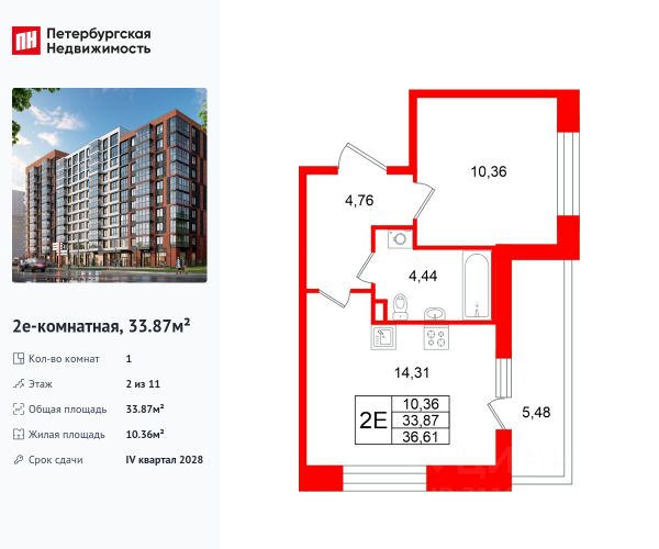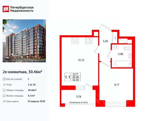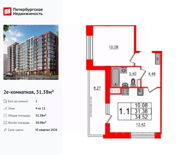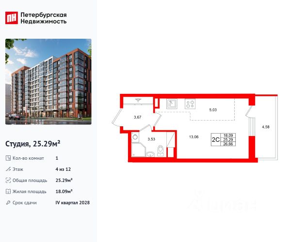 Общая площадь с балконом, составляет 26,98 кв. м.