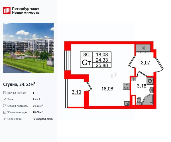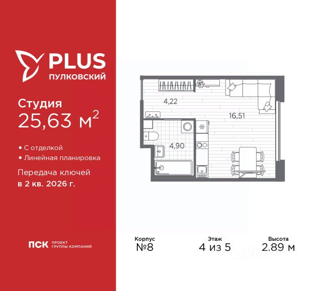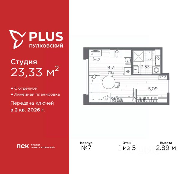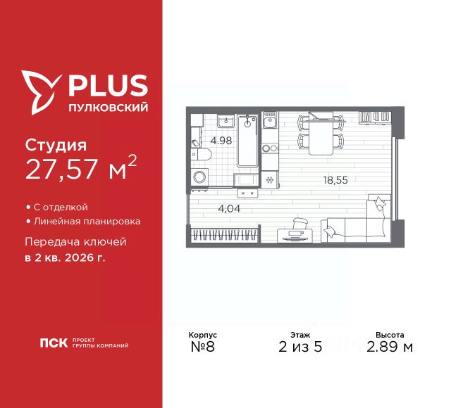 1-комн. квартира-студия с отделкой в ЖК "PLUS Пулковский" на 2 этаже. Общая площадь: 27.57 кв.м., площадь гостиной 18.55 кв.м., из которых 5 кв.м. выделено под кухонную зону. Все окна выходят на одну сторону. В квартире один совмещенный санузел. Высота потолков 2.89 м.