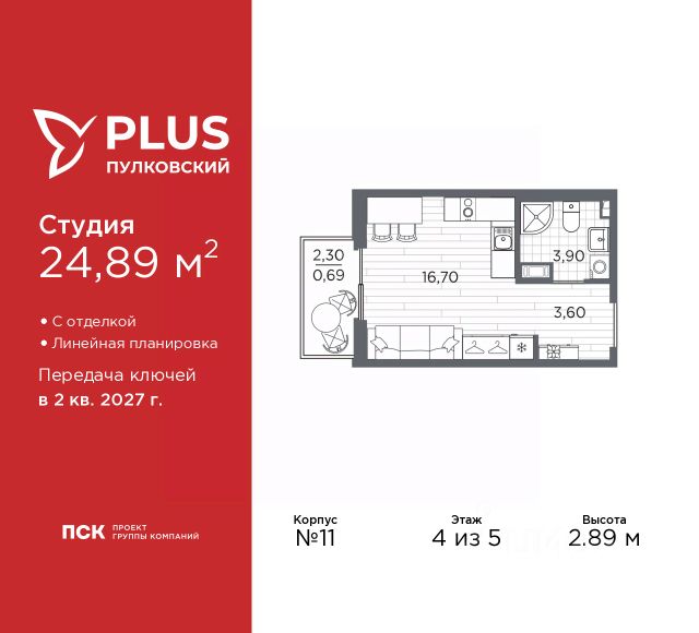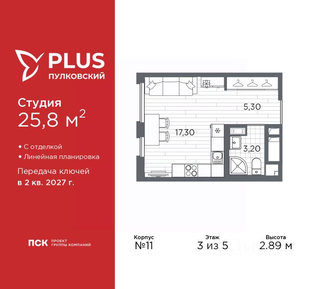1-комн. квартира-студия от застройщика с отделкой в ЖК "PLUS Пулковский" на 2 этаже. Общая площадь: 21.1 кв.м., площадь гостиной 13.3 кв.м., из которых 5 кв.м. выделено под кухонную зону. Все окна выходят на одну сторону. В квартире один совмещенный санузел. Высота потолков 2.89 м. Все квартиры в проекте сдаются с полной чистовой отделкой. Выполняется в двух стилистических решениях светлый стиль и темный современный стиль. Вам остается только расставить мебель. Важное преимущества отделки от застройщика в гарантии на все работы и в том, что фактическая стоимость полной отделки распределяется в ипотечных платежах при покупке в ипотеку. Дом монолитный, трехподъездный, высотой 5 этажей. Квартира находится в 3-й секции в корпусе 11. На этаже 9 квартир. В подъезде 1 грузовой лифт. Начало строительства - 1 квартал 2026 года. Окончание строительства - 2 квартал 2027 года. Оформление сделки по договору долевого участия. ЖК "PLUS Пулковский" расположен в престижном Московском районе на пересечении Пулковского и Волхонского шоссе, по которым можно быстро добраться до КАД и до станций метро Московская и Звёздная. Поблизости расположены дворцово-парковые ансамбли Пушкина, Павловска, Петергофа, Гатчины, Ломоносова, а также вся торговая и развлекательная инфраструктура: ТК Лето, Outlet Village Pulkovo, Пулково-3, гипермаркеты Лента, Окей, Metro. На территории комплекса будут построены средняя образовательная школа на 825 мест с двумя бассейнами, 2 детских сада на 220 мест каждый. В детских садах тоже будут бассейны. Кроме этого будет построен медицинский центр для взрослых и детей. Во дворах буду оборудованы спортивные и безопасные детские площадки, на первых этажах домов будут расположены коммерческие помещения. Для автолюбителей будут подземные и наземный паркинги. Для жителей домов будет доступно "приложение жителя", которое предоставит такие возможности: — дистанционное открытие дверей в парадную и на территорию комплекса, — просмотр изображений с видеокамер, — контроль за показаниями счетчиков, — коммуникация с УК. Показания всех счетчиков будут собираться дистанционно. В квартирах будет выполнена коллекторная разводка отопления в стяжке пола от коллекторов в межквартирных коридорах. Застройщик ЖК "PLUS Пулковский" - группа компаний ПСК, которая является одной из ведущих девелоперских компаний Санкт Петербурга. Более 16 лет она возводит в Северной столице качественное жилье премиум, бизнес и комфорт-класса, социальные объекты школы и детские сады, апарт-комплексы и торговые центры и является четырехкратным обладателем золотого знака "Надежный застройщик России". #zMceB9