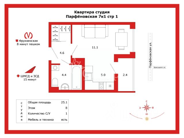 Продаётся студия в ЖК "Измайловский" на 7 этаже. Общая площадь составляет 20.40 кв. м. Квартира с white box отделкой. Жилой комплекс "Измайловский" располагается по адресу Санкт-Петербург, Адмиралтейский. "Измайловский" - новый проект бизнес-класса в историческом районе. Дом скрыт от шумных проспектов внутри уютного малоэтажного квартала с зелёными двориками. Расположение: • 10 мин пешком до станций метро "Фрунзенская", "Балтийская" и "Технологический институт"; • 10 мин на авто до Невского проспекта; • 5 мин на авто до Балтийского вокзала; • 10 мин на авто Витебского вокзала; • 30 мин на авто до Аэропорта Пулково. "Измайловский" строится в самом центре культурной, образовательной и деловой жизни Санкт-Петербурга. Здесь много гипермаркетов и офисов, кафе и пекарен. Культурная жизнь района пульсирует в креативных кластерах, таких как "Планетарий 1", "Бертгольд-центр", "Никольские ряды" и "Новая Голландия". Недалеко находятся памятники архитектуры: Троицкий, Никольский и Исаакиевский соборы, музей-усадьба Державина и другие. Рядом масса возможностей для разнообразного досуга: Молодежный театр, Мариинский театр и детский театр "На Неве". Встроенная система "Умный дом" будет открывать доступ в паркинг и парадные. Через приложение можно оформить гостевой доступ. Система умеет автоматически фиксировать показания счетчиков и совершать видеозвонки с домофона на смартфон. Безопасность жителей обеспечит система видеонаблюдения на территории, в холле дома и в паркинге. Преимущества: • Широкие окна, до 2,8 м; • Фильтры тонкой очистки воды; • Система "Умный дом"; • 5-ти ступенчатая система очистки воды; • Колясочные в каждой парадной; • На лифте из паркинга можно подняться на свой этаж к квартире. Успейте приобрести квартиру на выгодных условиях! Чтобы узнать подробности, обращайтесь за консультацией по телефону.