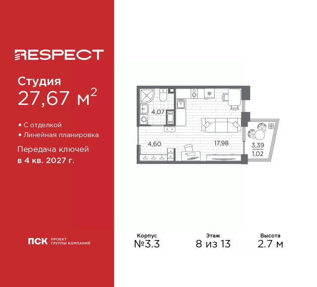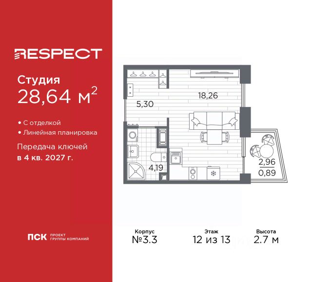 Просторная 1-комн. квартира-студия с отделкой в ЖК "RESPECT" на 12 этаже. Общая площадь: 28.64 кв.м., площадь гостиной 18.26 кв.м., из которых 5 кв.м. выделено под кухонную зону. Все окна выходят на одну сторону. В квартире один балкон, один совмещенный санузел. Высота потолков 2.7 м. В ЖК Respect представлены два варианта чистовой отделки: светлая и тёмная. Потолки: натяжные или выравнивание с окраской, Окна: из ПВХ профиля с двухкамерным стеклопакетом, Остекление балконов и лоджий: алюминиевое однослойное, Полы: покрытие из ламината, полы санузлов: керамическая плитка или керамогранит, Стены: обои под окраску, стены санузлов: керамическая плитка или керамогранит. Установлены межкомнатные двери. Санузел: раковина с тумбой, ванна или душевая кабина, унитаз, смесители. Выполнена полная разводка электропроводки. Дом монолитный, многоподъездный, переменной этажности, от 8 до 13 этажей. Квартира находится в 1-й секции высотой 13 этажей в корпусе 3.3. На этаже 6 квартир. В подъезде 1 пассажирский и 1 грузовой лифт. Начало строительства - 3 квартал 2025 года. Окончание строительства - 4 квартал 2027 года. Оформление сделки по договору долевого участия. В шаговой доступности от жилого комплекса находятся станции метро (расстояние по прямой): "Лесная" (800 м), "Площадь Мужества" (1.4 км), "Выборгская" (1.9 км), также недалеко от этого корпуса находятся станции метро: "Академическая", "Политехническая". Квартал строится на Полюстровском пр, 87, в одной из самых востребованных локаций Петербурга. В 10 минутах пешком - метро "Лесная" и в 10 минутах на транспорте - Петроградская сторона. Высота домов от 7 до 13 этажей. На территории Respect строится школа на 1125 учащихся и детский сад на 240 мест. Запроектированы собственная газовая котельная, закрытая территория, дворы без машин и подземные паркинги с лифтами. Вентилируемые фасады облицованы клинкерным кирпичом. Дома из этого материала служат веками, являясь гордостью хозяев. Дизайн парадных зон и входных групп - сочетание лаконичности отделки и декоративных элементов с текстурами из натурального камня и дерева с приглушенной подсветкой теплым светом. Во входных группах расположены гостевые зоны с мягкой мебелью. Вся территория квартала будет связана единой концепцией благоустройства, разработанной ландшафтным бюро L.BURO. В основе - идея создания увлекательного ландшафтного пространства для насыщенной жизни, включающего в себя пейзажные зоны, современные архитектурные композиции, открытые террасы на стилобатах с зонами отдыха и парклетами, спортивными площадками. Это пространство для людей всех возрастов и различных увлечений. На эксплуатируемой кровле на уровне первого этажа в домах 1 и 4 будут обустроены общественные видовые террасы. В квартале запроектированы внутренние закрытые территории дворов домов без доступа автомобилей и безбарьерная среда для велосипедистов и колясок. Предусмотрены IP-домофония с функцией дистанционного открывания калиток и парадных, а также дистанци