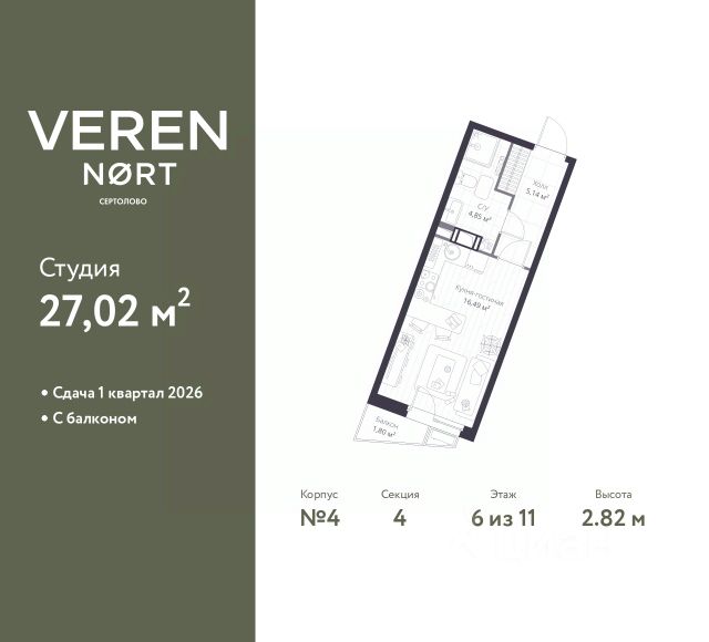 Спешите забронировать по этой цене, срок акции ограничен! Стоимость квартиры указана со скидкой, ваша экономия составит 1,663,547 руб. Звоните, мы вам все подробно расскажем. Продается 1-комн. квартира-студия от застройщика в ЖК "Верен Норт Сертолово" на 8 этаже. Квартира без отделки, новый владелец может сделать ремонт по индивидуальному дизайн-проекту. Общая площадь: 24.6 кв.м., площадь гостиной 15.82 кв.м., из которых 5 кв.м. выделено под кухонную зону. Все окна выходят на одну сторону. В квартире один балкон, один совмещенный санузел. Высота потолков 2.82 м. Квартира находится в корпусе 1. Дом монолитный, одноподъездный, высотой 11 этажей. На этаже 14 квартир. В подъезде 2 грузовых лифта. Начало строительства - 3 квартал 2023 года. Окончание строительства - 1 квартал 2026 года. Оформление сделки по договору долевого участия. С балконом, вид на приватный двор. Сочетание современной архитектуры и отличной экологии севера Лен. области. Выразительный облик домов разработан именитым архитектурным бюро "Остоженка". Характеристики жилого комплекса исключительны: продуманный ландшафтный дизайн, оригинальные парадные, разработанные по индивидуальному дизайн-проекту, современные детские и многофункциональные спортивные площадки, летний кинотеатр под открытым небом, два детских сада. Комплекс создается в уже сложившейся инфраструктуре г. Сертолово и обладает удобным транспортным сообщением с Санкт-Петербургом. В 300 метрах от "Верен Норт Сертолово" планируется транспортно-пересадочный узел "Сертолово", который обеспечит удобную железнодорожную связь с Финляндским вокзалом Санкт-Петербурга. #zUdvD6