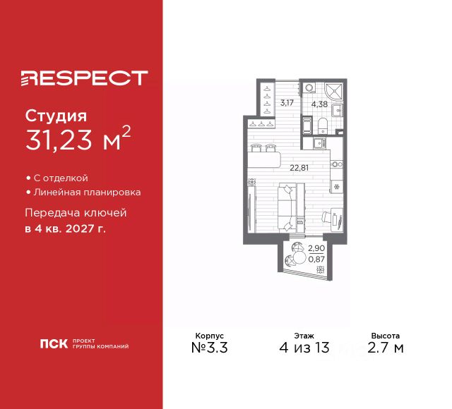 1-комн. квартира-студия от застройщика с предчистовой отделкой в ЖК "RESPECT" на 8 этаже. Общая площадь: 32.8 кв.м., площадь гостиной 20.8 кв.м., из которых 5 кв.м. выделено под кухонную зону. Все окна выходят на одну сторону. В квартире один балкон, один совмещенный санузел. Высота потолков 2.7 м. Дом монолитный, многоподъездный, переменной этажности, от 10 до 13 этажей. Квартира находится в 1-й секции высотой 13 этажей в корпусе 3.2. На этаже 5 квартир. В подъезде 1 пассажирский и 1 грузовой лифт. Начало строительства - 3 квартал 2025 года. Окончание строительства - 4 квартал 2027 года. Оформление сделки по договору долевого участия. В шаговой доступности от жилого комплекса имеются станции метро (расстояние по прямой): "Лесная" (800 м), "Площадь Мужества" (1.4 км), "Выборгская" (1.9 км), также недалеко от этого корпуса находятся станции метро: "Академическая", "Политехническая". Жилой квартал "RESPECT" строится на Полюстровском пр, 87, в одной из самых востребованных локаций Петербурга. В 10 минутах пешком - метро "Лесная" и в 10 минутах на транспорте - Петроградская сторона. Высота домов от 7 до 13 этажей. Квартиры сдаются с отделкой white box и с чистовой отделкой. На территории Respect строится школа на 1125 учащихся и детский сад на 240 мест. Запроектированы собственная газовая котельная, закрытая территория, дворы без машин и подземные паркинги с лифтами. В проекте предусмотрены трапециевидные балконы или остекленные лоджии, которые, с одной стороны, исключают монотонность фасада, являясь декоративными элементами, с другой дополнительным функциональным пространством в квартирах. Цветовая гармония фасадов каждого дома раскрывает характер квартала. Коричневый цвет клинкерного кирпича со структурой водяных штрихов — цвет уюта и безопасности, сдержанности и надёжности. Вентилируемые фасады облицованы клинкерным кирпичом. Его высокая прочность позволяет давать 100 лет гарантии на этот материал. Водопоглощение клинкерного кирпича составляет менее 5%, за счет чего у него высокая теплопроводность и прочность. В квартале запроектированы внутренние закрытые территории дворов домов без доступа автомобилей и безбарьерная среда для велосипедистов и колясок. Предусмотрены IP-домофония с функцией дистанционного открывания калиток и парадных, а также дистанционный сбор показаний счетчиков и мобильное приложение для жителей. Для безопасности жителей квартала - круглосуточное видеонаблюдение и служба охраны. В каждой квартире предусмотрены внешние корзины для кондиционеров. Вся территория квартала будет связана единой концепцией благоустройства, разработанной ландшафтным бюро L.BURO. На эксплуатируемой кровле на уровне первого этажа в домах 1 и 4 будут обустроены общественные видовые террасы. Это станет не только привлекательным местом с красивым видом, но и удобным, многофункциональным пространством. Дизайн парадных зон и входных групп - сочетание лаконичности отделки и декоративных элементов с текстурами из натурального камня и де Продается квартира-студия с балконом рядом с метро Выборгская.