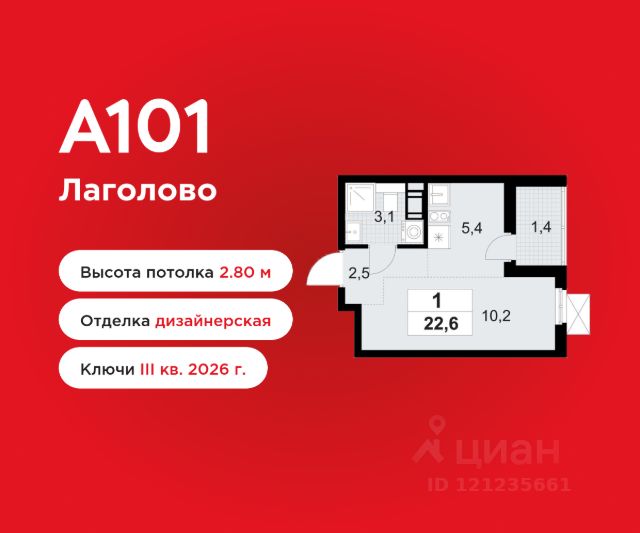 Студия площадью 23.62 в ЖК "А101 Лаголово" на 3 этаже. Квартира без отделки. Вид из окна на улицу. В квартире 1 санузел. Высота потолков 2.84 м. ОТДЕЛКА Квартира передается без отделки. Благодаря тому, что в данном типе отделки стены не возводятся, вы сможете создать удобную планировку и самостоятельно организовать зонирование комнат. ДВОРЫ И ОКРУЖЕНИЕ Мы реализуем новый уровень в благоустройстве, а масштаб инфраструктуры поражает воображение: площадь дворов и пешеходного бульвара равна 64 теннисным кортам, а пешеходные дорожки протяжённостью 6,5 тысяч шагов позволяют неспешно прогуляться и насладиться окружающей красотой района. Для детей: яркие игровые комплексы, тактильная тропа и полоса препятствий Для отдыха: уютные зоны с навесами, столами и зарядками Для спорта: просторные площадки для игр, настольный теннис и открытые газоны для йоги и бадминтона Для экстрима: оборудованная трасса для велосипедов, самокатов, скейтбордов и роликов Для души: общественный сад и разнообразное озеленение Каждый двор оборудован системами видеонаблюдения и контроля доступа, закрыт от машин и посторонних. Не забываем о природе: вблизи расположены живописные Дудергофские озёра, величественные леса и поля. Зелёные зоны создают атмосферу уединения, помогая забыть о городской суете и наполниться энергией природы. ПАРАДНАЯ Для вашего комфорта предусмотрен удобный вход без ступеней, соответствующий принципам доступной среды для всех жителей, а также оборудовано отдельное помещение для хранения колясок и велосипедов в каждой парадной. ИНФРАСТРУКТУРА Время для себя и близких - бесценно. Именно поэтому "А101 Лаголово" - это не просто дома, а продуманная экосистема, где всё необходимое находится в 15 минутах от вашего дома. Здесь есть кафе, рестораны, коворкинги, детские площадки, спортивные секции, магазины и сервисы- всё для комфортной жизни в шаговой доступности. В проекте предусмотрены 3 современные школы. Строительство первой школы Акватория уже началось. Помимо современных классов, здесь появятся многофункциональные амфитеатры, трансформируемый спортзал, студия звукозаписи, медиатека и библиотека с большим количеством книг. Более 3 гектаров пришкольной территории отведено под спортивное ядро. В жилом районе также запланировано строительство 8 новых детских садов. ЗАСТРОЙЩИК ГК "А101" - один из крупнейших застройщиков России. Каждая восьмая квартира, проданная в Москве, находится в районе, построенном компанией, что подчеркивает её значимость и успех на рынке недвижимости.