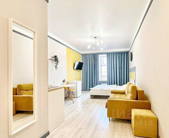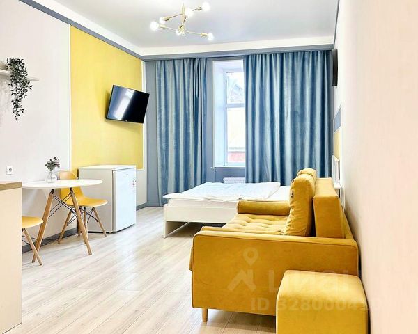 — Студия оборудована техникой и мебелью, необходимой для жизни: индукционная плита, кровать с новым матрасом, кресло, холодильник, стиральная машина, бойлер, журнальный столик, тумба под ТВ, 4 стеллажа. Вся мебель и техника остаются новым владельцам — заезжай и живи