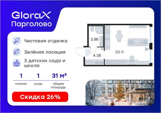 Продается квартира-студия на 1-м этаже в проекте комфорт-класса GloraX Парголово. Общая площадь лота составляет 31,63 кв. м, из которых 22,92 кв. м отведено под жилую и кв. м под кухонную зону. Номер квартиры - 5. Преимущества: - Квартира комфорт-класса с полной чистовой отделкой - Зеленый район, Шуваловский парк в 20 мин. пешком - 10 мин. до КАД, 15 мин. до ЗСД - 5 эт. паркинг на 451 м/м - Закрытые дворы с видеонаблюдением - Детские площадки с геопласткой и бизиборадми - Сады и школы в шаговой доступности - Спортивные площадки и велодорожки - Собственный комьюнити-центр - Келлеры для хранения - Коммерческие помещения на 1 этажах GloraX Парголово — масштабный проект комфорт-класса в Выборгском районе Санкт-Петербурга. Место, продуманное до мелочей, где все, что необходимо — рядом. Архитектурно-пространственное решение отличается лаконичностью и строгостью и придает проекту свой характер. Внутренние дворы закрыты от внешнего мира, создавая приватную территорию для жителей. Живите на природе, но с комфортом мегаполиса. Десять минут на велосипеде или полчаса пешком — и вы окажетесь в одном из культовых мест отдыха петербуржцев: Шуваловском парке, Орловском заказнике с их чистыми карьерами или на Суздальских озерах. До ж/д станции "Парголово" 7 минут на автомобиле, до метро Проспект Просвещения 25 минут, КАД 10 минут, ЗСД 15 минут. В шаговой доступности остановка общественного транспорта. В шаговой доступности — собственные школы и детские сады. Здесь все создано для максимального комфорта каждого жителя. Приватное пространство внутреннего двора с беседками с розетками для работы и отдыха, зеленый двор с уютным многоуровневым освещением, детскими эко-площадками и спортивными workout создает неповторимую атмосферу, заряжающую энергией на новые свершения. Цена указана при 100% оплате или стандартной ипотеке. Узнайте подробности в Отделе продаж.