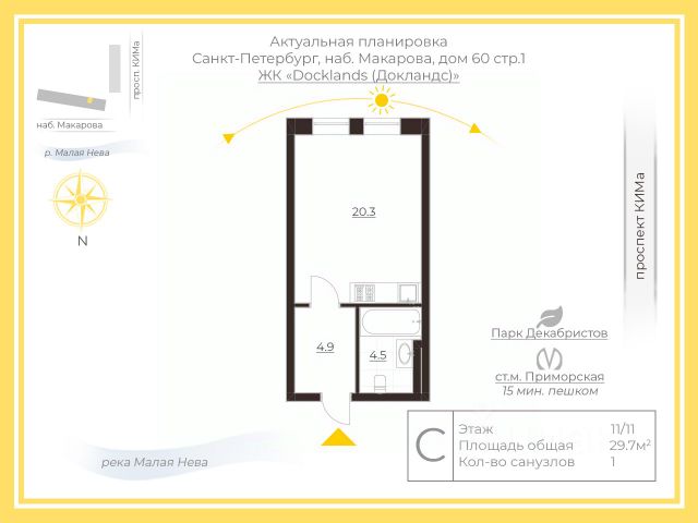 Лофт-проект Docklands расположен в Василеостровском районе по адресу: набережная Макарова, д. 60, 58. Архитектурную концепцию проекта подготовило немецкое архитектурное бюро Лофт-проект, выполненный в индустриальном стиле XX века, представляет собой кирпично-монолитный комплекс апартаментов. Первая очередь включает в себя корпус 3, состоящий из двух четырехзвездочных апарт-отелей высотой 11 этажей, рассчитанных в общей сложности на 406 юнитов.