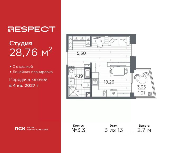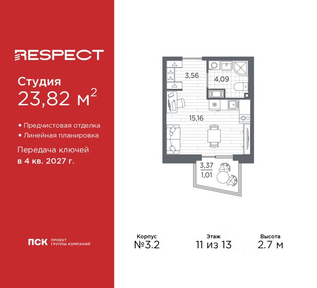 Продается 1-комн. квартира-студия с отделкой в ЖК "RESPECT" на 3 этаже. Общая площадь: 31.23 кв.м., площадь гостиной 22.81 кв.м., из которых 5 кв.м. выделено под кухонную зону. Все окна выходят на одну сторону. В квартире один балкон, один совмещенный санузел. Высота потолков 2.7 м. Дом монолитный, многоподъездный, переменной этажности, от 8 до 13 этажей. Квартира находится в 1-й секции высотой 13 этажей в корпусе 3.3. На этаже 6 квартир. В подъезде 1 пассажирский и 1 грузовой лифт. Начало строительства - 3 квартал 2025 года. Окончание строительства - 4 квартал 2027 года. Оформление сделки по договору долевого участия. В шаговой доступности от жилого комплекса имеются станции метро (расстояние по прямой): "Лесная" (800 м), "Площадь Мужества" (1.4 км), "Выборгская" (1.9 км), также недалеко от этого корпуса находятся станции метро: "Академическая", "Политехническая". Жилой квартал "RESPECT" строится на Полюстровском пр, 87, в одной из самых востребованных локаций Петербурга. В 10 минутах пешком - метро "Лесная" и в 10 минутах на транспорте - Петроградская сторона. Высота домов от 7 до 13 этажей. Квартиры сдаются с отделкой white box и с чистовой отделкой. На территории Respect строится школа на 1125 учащихся и детский сад на 240 мест. Запроектированы собственная газовая котельная, закрытая территория, дворы без машин и подземные паркинги с лифтами. В проекте предусмотрены трапециевидные балконы или остекленные лоджии, которые, с одной стороны, исключают монотонность фасада, являясь декоративными элементами, с другой дополнительным функциональным пространством в квартирах. Цветовая гармония фасадов каждого дома раскрывает характер квартала. Коричневый цвет клинкерного кирпича со структурой водяных штрихов — цвет уюта и безопасности, сдержанности и надёжности. Вентилируемые фасады облицованы клинкерным кирпичом. Его высокая прочность позволяет давать 100 лет гарантии на этот материал. Водопоглощение клинкерного кирпича составляет менее 5%, за счет чего у него высокая теплопроводность и прочность. В квартале запроектированы внутренние закрытые территории дворов домов без доступа автомобилей и безбарьерная среда для велосипедистов и колясок. Предусмотрены IP-домофония с функцией дистанционного открывания калиток и парадных, а также дистанционный сбор показаний счетчиков и мобильное приложение для жителей. Для безопасности жителей квартала - круглосуточное видеонаблюдение и служба охраны. В каждой квартире предусмотрены внешние корзины для кондиционеров. Вся территория квартала будет связана единой концепцией благоустройства, разработанной ландшафтным бюро L.BURO. На эксплуатируемой кровле на уровне первого этажа в домах 1 и 4 будут обустроены общественные видовые террасы. Это станет не только привлекательным местом с красивым видом, но и удобным, многофункциональным пространством. Дизайн парадных зон и входных групп - сочетание лаконичности отделки и декоративных элементов с текстурами из натурального камня и дерева с приглушенн