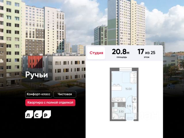 Продаётся студия в ЖК "Ручьи" на 14 этаже. Общая площадь составляет 21.00 кв. м. Квартира с чистовой отделкой. Жилой комплекс "Ручьи" располагается по адресу Санкт-Петербург, Красногвардейский. ЖК "Ручьи" - крупный проект комфорт-класса в Красногвардейском районе, на Пискаревском проспекте. В новостройке эргономичные планировки, уютные пешеходные дворы без машин, с детскими и спортивными площадками. Расположение комплекса: • 10 минут до станции метро "Академическая" на автобусе; • 10 минут до ж/д станции "Ручьи"; • 5 минут до КАД на автомобиле. Первая очередь уже заселена, во второй очереди появятся 27 домов. Квартиры передаются с отделкой. Парадные устроены на уровне земли - без ступеней и высоких порогов, а зайти внутрь можно как со стороны двора, так и с улицы. ЛСР построит на территории комплекса школу и два детских сада. Между домами будут обустроены игровые и спортивные площадки с турниками и тренажерами, удобные зоны отдыха для детей и взрослых. Первые этажи отведены под колясочные, магазины и сервисные службы. Здесь есть всё необходимое для комфортной жизни: магазины, аптеки, парикмахерские, пекарни и кофейни, достаточно спуститься на лифте во двор своего дома. Вокруг квартала пройдет велодорожка. Преимущества комплекса: - Большой выбор семейных квартир с просторной кухней-гостиной - Рядом Муринский и Пискаревский парки - Безбарьерная среда - Развитая социальная инфраструктура - Двор без машин Успейте приобрести квартиру на выгодных условиях! Чтобы узнать подробности, обращайтесь за консультацией по телефону.