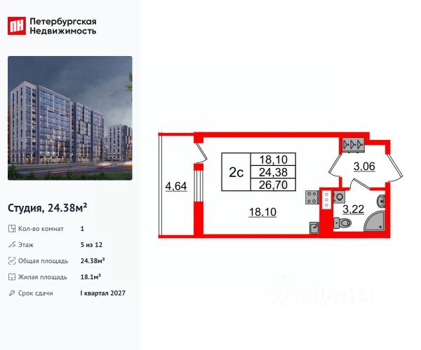 В продаже квартира-студия с панорамным видом в ЖК "Северная Долина".