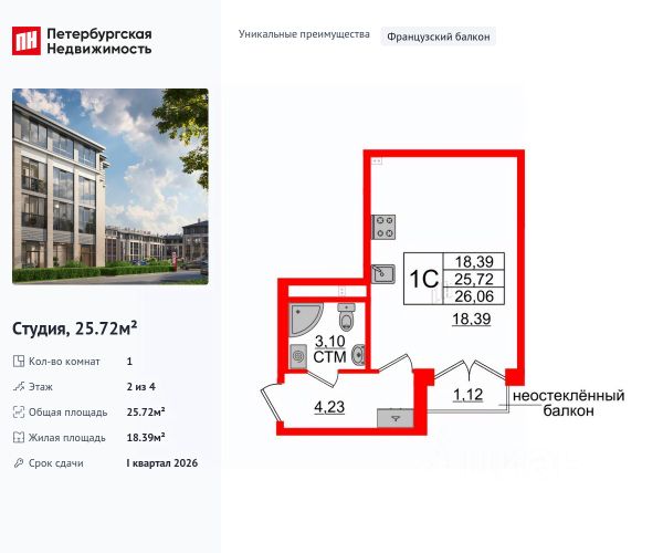 Удобная, классическая, функциональная европланировка, вместительная прихожая 3.07 м². Общая площадь студии - 24.56 м², жилая 18.04 м², высота потолка 2.8 м.