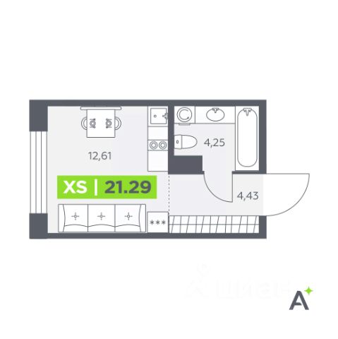 • Фактически 1-комнатная квартира — студия правильной формы, удобна для меблировки, кухня зонирована стеной.