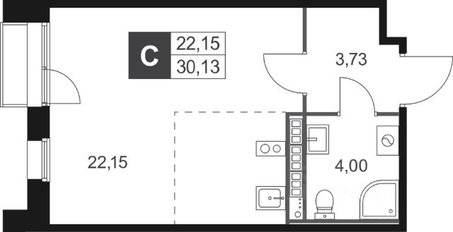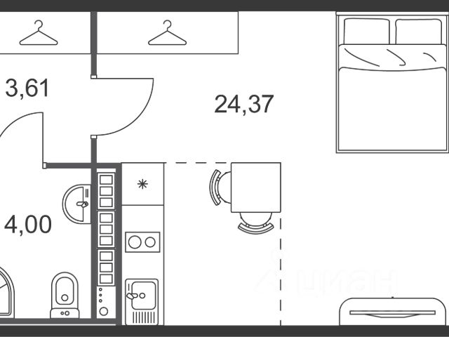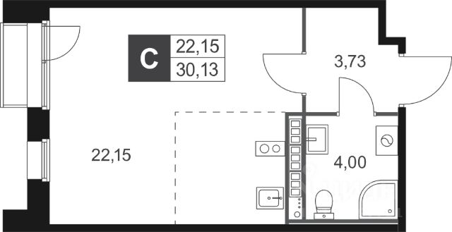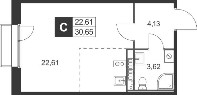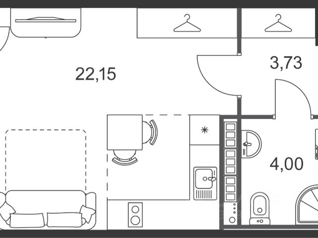 Квартира-студия с натяжными потолками, общей площадью 25,1м², жилая площадь 18,29м², прихожая - 3,80м², санузел - 3,25м²