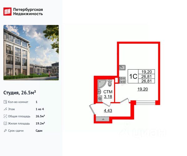 Продается просторная студия от застройщика в жилом комплексе "Дворцовый фасад" в неповторимом Петродворцовом районе. До метро можно добраться на транспорте всего за 25 минут. Удобная, классическая, функциональная европланировка, просторная прихожая 4.43 м². Общая площадь студии - 26.5 м², жилая 19.2 м², высота потолка 2.77 м. Квартира продается с отделкой "NORD LINE WHITE". Что особенного в ЖК "Дворцовый фасад"? • В окружении дворцово-парковых ансамблей: Стрельна, Константиновский дворец, Петергоф, парк Новознаменка и Сосновая поляна, Шунгеровский лесопарк • Два собственных парка: парадный верхний для спокойного отдыха, нижний для активных занятий • Проект, соответствующий стандартам экологичного строительства, энергоэффективности, экономии и комфорта • Квартиры с саунами, возможностью установки камина и палисадниками • Малоэтажный жилой комплекс: всего 4 этажа, более половины квартир с увеличенной высотой потолка: от 3 до 5,5 м