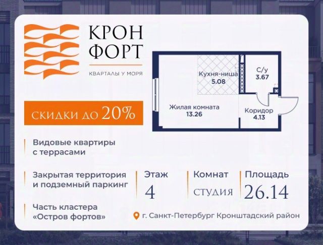 Стоимость квартиры указана со скидкой 20%. Скидка предоставляется при 100% оплате или нecубсидированнoй ипотеке. Прeдлaгaeтcя кваpтиpa площaдью 25.42 кв.м в жилoм комплексe "Кpoнфорт. Центрaльный" в Caнкт-Пeтербуpгe (Kpoнштадт). Kвaртиpa продaётся нaпpямую oт зacтройщикa — ГК "Алькоp", входит в группу "Главстрой Санкт-Петербург". Возможна покупка с использованием льготных и специальных ипотечных программ с государственной поддержкой. "Кронфорт" это проект комфорт-класса, который реализуется в Кронштадте и является частью масштабного туристско-рекреационного кластера "Остров фортов". Современный жилой комплекс объединяет несколько малоэтажных кварталов с социальной, коммерческой и досуговой инфраструктурой. Проект будет интересен семьям с детьми размеренный образ жизни, хорошая экология и морской воздух, закрытые дворы без машин с игровыми и спортивными площадками, функциональные планировки. Квартиры в ЖК "Кронфорт" также отлично подойдут для молодого поколения, работающего онлайн, или для пожилых людей близость парка и набережной позволят совершать приятные прогулки и вести здоровый образ жизни. Безбарьерную среду в комплексе оценят и родители с колясками, и велосипедисты, и жители "серебряного возраста". Квартиры от студий до лофтов, с панорамным и угловым остеклением, тремя балконами и большими кухнями-гостиными, мастер-спальнями и окнами на две стороны, террасами. Метраж варьируется от 24 до 106 кв. м. Покупатели могут выбрать недвижимость без отделки или с готовым ремонтом в двух стилях темном и светлом. Транспортная доступность: Жилой квартал "Кронфорт. Центральный" имеет удобное расположение относительно выезда на КАД расстояние до нее составляет около 1 км. - 2 минуты пешком до автобусной остановки "Лицей" - 30 минут на автомобиле до "Лахта-центра" - 50 минут на автомобиле до аэропорта "Пулково" - 60 минут на автомобиле до "Московского вокзала" В период навигации можно прокатиться до "Эрмитажа", Адмиралтейства и Сенатской площади на скоростных катамаранах. Инфраструктура: Напротив ЖК "Кронфорт. Центральный" открыт инженерный лицей. Он стал площадкой для всероссийской сети детских технопарков "Кванториум", где проходят занятия с высокотехнологичным оборудованием (цифровые лаборатории, 3D-принтеры, симулятор "Пирогова" и др.) для изучения передовых технологий. Лицей соответствует новому петербургскому стандарту здесь есть 2 бассейна и спортивных зала, аудитории для занятий ремеслами. Также в "Кронфорт. Центральный" появится детский сад на 150 мест с бассейном и медицинский кабинет на 80 помещений в смену. Преимущества ЖК "Кронфорт": - Малоэтажный жилой комплекс с авторской архитектурой, разработанной с участием компании Chapman Taylor и петербургского бюро "Проектная культура", - Подземный паркинг и кладовые для удобства жильцов, - Более 100 видов планировочных решений, - Высота потолков в квартирах от 3 до 3,4 метров. Купить квартиру-студию в Кронштадте.