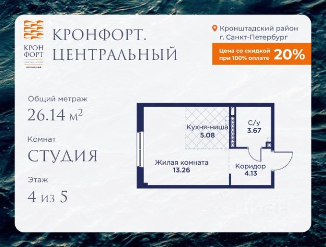 Стоимость квартиры указана со скидкой 20%. Скидка предоставляется при 100% оплате или несубсидированной ипотеке. Предлагается квартира площадью 24.55 кв.м в жилом комплексе "Кронфорт. Центральный" в Санкт-Петербурге (Кронштадт). Возможна покупка с использованием льготных и специальных ипотечных программ с государственной поддержкой. Высота потолков в квартирах — от 3 до 3,4 метров, окна увеличенного размера, есть варианты с эркерами, французскими балконами, лоджиями и террасами. Жилой квартал состоит из пяти четырехэтажных корпусов с закрытыми охраняемыми дворами, свободными от машин. Первые этажи формируют торговые променады в стиле пешеходных улиц исторической части Петербурга и Кронштадта. Внутренние пространства между корпусами — пешеходные зоны с уютными площадями. Архитектурный облик квартала разработан бюро "Проектная культура" и международной компанией Chapman Taylor. Инфраструктура комплекса включает: - Лицей с двумя бассейнами - Детский сад на 150 мест с бассейном и закрытой территорией - Веревочный парк - Игровые площадки для активного отдыха; - Кабинет врача общей практики. - Подземные паркинги с лифтами. - Мусоросборные камеры, индивидуальные кладовые. - Закрытые дворы с контролем доступа и видеонаблюдением. - Мультформатный стрит-ретейл с кафе и ресторанами. - Триатлон-центр и беговые/велодорожки. - Учебно-тренировочный комплекс для детей "Лагерь настоящих героев". Транспортная доступность обеспечивает удобный выезд на КАД (около 1-3 км), 2 минуты пешком до автобусной остановки "Лицей", 25 минут до Сестрорецка, 30 минут до "Лахта-центра", 50 минут до аэропорта "Пулково" и 60 минут до Московского вокзала. Для любителей моря доступен маршрут на "Метеоре" до центра Санкт-Петербурга. Отделка квартир предлагается как с готовой чистовой отделкой, так и со свободной планировкой без отделки для реализации индивидуальных дизайнерских решений. В третьем корпусе, продажи которого стартовали в марте 2025 года, доступны квартиры с просторными террасами, тремя балконами, кухнями-гостиными до 38 кв.м с окнами на две стороны, обеспечивающими панорамное освещение и виды. Если вам нужна помощь с оформлением ипотеки или дополнительная информация по комплексу и условиям покупки, обращайтесь в отдел продаж за консультацией.