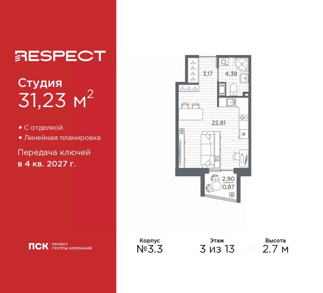 Просторная 1-комн. квартира-студия с предчистовой отделкой в ЖК "RESPECT" на 4 этаже. Общая площадь: 23.82 кв.м., площадь гостиной 15.14 кв.м., из которых 5 кв.м. выделено под кухонную зону. Все окна выходят на одну сторону. В квартире один балкон, один совмещенный санузел. Высота потолков 2.7 м. Дом монолитный, многоподъездный, переменной этажности, от 10 до 13 этажей. Квартира находится в 1-й секции высотой 13 этажей в корпусе 3.2. На этаже 5 квартир. В подъезде 1 пассажирский и 1 грузовой лифт. Начало строительства - 3 квартал 2025 года. Окончание строительства - 4 квартал 2027 года. Оформление сделки по договору долевого участия. В шаговой доступности от жилого комплекса расположены станции метро (расстояние по прямой): "Лесная" (800 м), "Площадь Мужества" (1.4 км), "Выборгская" (1.9 км), также недалеко от этого корпуса расположены станции метро: "Академическая", "Политехническая". Жилой квартал "RESPECT" строится на Полюстровском пр, 87, в одной из самых востребованных локаций Петербурга. В 10 минутах пешком - метро "Лесная" и в 10 минутах на транспорте - Петроградская сторона. Высота домов от 7 до 13 этажей. Квартиры сдаются с отделкой white box и с чистовой отделкой. На территории Respect строится школа на 1125 учащихся и детский сад на 240 мест. Запроектированы собственная газовая котельная, закрытая территория, дворы без машин и подземные паркинги с лифтами. В проекте предусмотрены трапециевидные балконы или остекленные лоджии, которые, с одной стороны, исключают монотонность фасада, являясь декоративными элементами, с другой дополнительным функциональным пространством в квартирах. Цветовая гармония фасадов каждого дома раскрывает характер квартала. Коричневый цвет клинкерного кирпича со структурой водяных штрихов — цвет уюта и безопасности, сдержанности и надёжности. Вентилируемые фасады облицованы клинкерным кирпичом. Его высокая прочность позволяет давать 100 лет гарантии на этот материал. Водопоглощение клинкерного кирпича составляет менее 5%, за счет чего у него высокая теплопроводность и прочность. В квартале запроектированы внутренние закрытые территории дворов домов без доступа автомобилей и безбарьерная среда для велосипедистов и колясок. Предусмотрены IP-домофония с функцией дистанционного открывания калиток и парадных, а также дистанционный сбор показаний счетчиков и мобильное приложение для жителей. Для безопасности жителей квартала - круглосуточное видеонаблюдение и служба охраны. В каждой квартире предусмотрены внешние корзины для кондиционеров. Вся территория квартала будет связана единой концепцией благоустройства, разработанной ландшафтным бюро L.BURO. На эксплуатируемой кровле на уровне первого этажа в домах 1 и 4 будут обустроены общественные видовые террасы. Это станет не только привлекательным местом с красивым видом, но и удобным, многофункциональным пространством. Дизайн парадных зон и входных групп - сочетание лаконичности отделки и декоративных элементов с текстурами из натурального камня