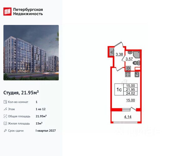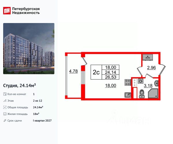 Просторная 1-комн. квартира-студия с предчистовой отделкой в ЖК "Сезоны" на 2 этаже. Общая площадь: 25.61 кв.м., площадь гостиной 18.95 кв.м., из которых 5 кв.м. выделено под кухонную зону. Все окна выходят на одну сторону. В квартире один совмещенный санузел. Высота потолков 2.88 м. Дом монолитный, многоподъездный, высотой 7 этажей. Квартира находится в 1-й секции в корпусе 611. На этаже 4 квартиры. В подъезде 1 грузовой лифт. Начало строительства - 4 квартал 2025 года. Окончание строительства - 2 квартал 2028 года. Оформление сделки по договору долевого участия. Видовой жилой комплекс "Сезоны" от ГК ПСК возводится в одном из самых востребованных и престижных районов Санкт-Петербурга - Приморском, рядом с Суздальским и Выборгским шоссе. Такое расположение обеспечивает удобный выезд в разные части города, сочетая городской комфорт с близостью к природе. Всего в 50 метрах находится природный заказник "Новоорловский" и речка Каменка, а в пешей доступности - Суздальские озёра. Приморский район отличается развитой социальной и транспортной инфраструктурой. Здесь расположены крупные торговые и деловые центры, современные спортивные объекты, медицинские учреждения, магазины, кафе и рестораны. Комплекс включает четыре корпуса, ввод которых в эксплуатацию запланирован на 2028 год. Проект и прилегающий микрорайон разработаны в соответствии с концепцией "15-минутного города", при которой вся необходимая инфраструктура находится в шаговой доступности. В ближайшем окружении - две школы, пять детских садов, магазины, кафе, салоны красоты, банковские отделения и пункты выдачи заказов. Также предусмотрены два четырёхъярусных паркинга с лифтами на 288 машиномест. О застройщике ГК ПСК - один из крупнейших девелоперов Санкт-Петербурга с более чем 18-летней историей. Компания реализует проекты во всех сегментах недвижимости - от премиальных жилых комплексов до масштабных кварталов комфорт-класса и апарт-отелей. По данным портала ЕРЗ.РФ, ПСК входит в ТОП-3 крупнейших застройщиков Санкт-Петербурга по объёму текущего строительства. Портфель компании превышает 3 млн кв. м жилой и коммерческой недвижимости. Все объекты сдаются строго в срок и отличаются высоким уровнем архитектурных и инженерных решений. #2too82