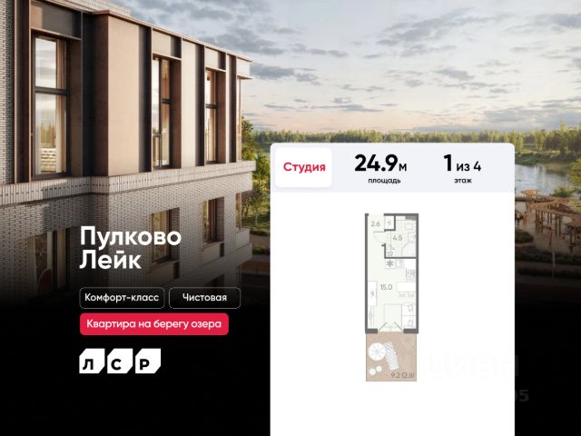 Продается студия в ЖК "Пулково Лейк" на 2 этаже. Общая площадь составляет 22.10 кв. м. Квартира с чистовой отделкой. Жилой комплекс "Пулково Лейк" располагается по адресу Санкт-Петербург, Московский. Пулково Лейк - проект малоэтажной застройки на берегу озера на границе Московского и Пушкинского районов. Дома высотой всего 4 этажа, квартиры от уютных студий до трехкомнатных квартир для большой семьи. Широчайший выбор планировок, включая квартиры с мастер-спальнями, патио, каминами, саунами, двухуровневые квартиры. Школа, детские сады, парк на берегу озера и выезды на Пулковское и Петербургское шоссе. Расположение: • 5 мин на авто до Аэропорта Пулково; • 10 мин на авто до станций метро "Московская; • 10-15 мин на авто до городов Пушкина, Павловска и Гатчины; • 20 мин на авто до центра Санкт-Петербурга. Квартиры в проекте сдаются с предчистовой и чистовой отделкой Соmfоrt Stоnе и Соmfоrt Wооd по современным стандартам - Вы можете сами выбрать отделку, подходящую именно Вам. Дома оборудованы самыми современными инженерными системами и "Умным домом". В рамках проекта будет построена современная школа на 925 мест и 2 детских сада на 160 и 240 мест, выезды на Пулковское и Петербургское шоссе, а также храм рядом со сквером "Пулковский рубеж". Общественное пространство вдоль берега озера превратится во всесезонный парк, в котором найдется место для любых активностей от пробежек, катания на САПах и велосипедах до отдыха в шезлонгах и любования закатом солнца. Зимой будет работать каток, проложен лыжный маршрут, предусмотрено место для новогодней елки и горок для детей. Для Ваших питомцев - площадка для выгула собак. Преимущества: • Высота потолков от 2,6 до 4,5 м; • Уникальные планировки; • Парк на берегу озера; • Система "Умный дом"; • Дворы без машин; • Колясочная в парадной; • Видеонаблюдение в холлах, на первом этаже, в лифтах и в паркингах. Успейте приобрести квартиру на выгодных условиях! Чтобы узнать подробности, обращайтесь за консультацией по телефону.