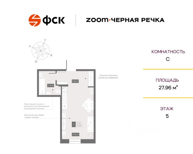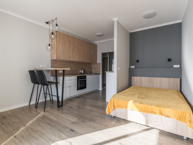 Квартира-студия 28 м2 с КОМФОРТНОЙ планировкой, с панорамным остеклением, выделенной кухонной и обеденной зонами, окна выходят на юго-запад.