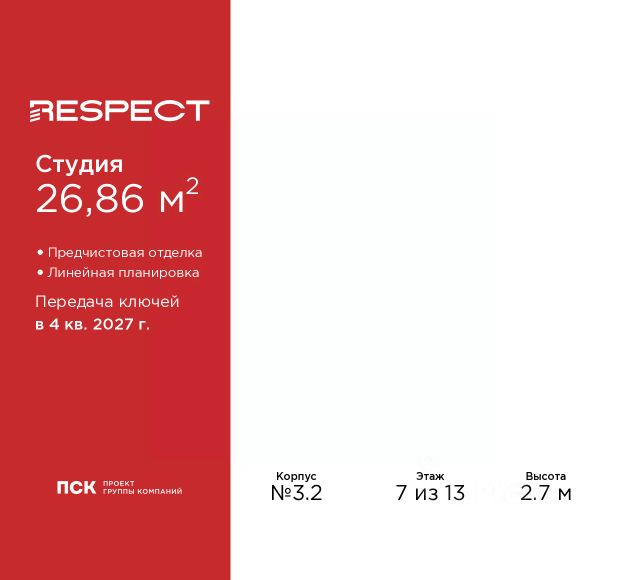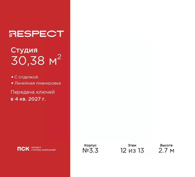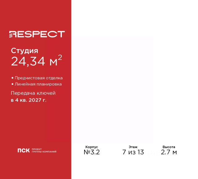 1-комн. квартира-студия от застройщика с предчистовой отделкой в ЖК "RESPECT" на 8 этаже. Общая площадь: 26.335 кв.м., площадь гостиной 16.55 кв.м., из которых 5 кв.м. выделено под кухонную зону. Все окна выходят на одну сторону. В квартире один балкон, один совмещенный санузел. Высота потолков 2.7 м. Квартира будет сдана с отделкой WHITE BOX, в которую включены следующие виды работ: - заливка стяжки; - установлена система отопления квартиры; - подготовлены потолки; - все стены выровнены, загрунтованы и отштукатурены; - электрическая проводка разведена по комнатам. Квартира будет готова к чистовой отделке. Дом монолитный, многоподъездный, переменной этажности, от 10 до 13 этажей. Квартира находится в 1-й секции высотой 13 этажей в корпусе 3.2. На этаже 5 квартир. В подъезде 1 пассажирский и 1 грузовой лифт. Начало строительства - 3 квартал 2025 года. Окончание строительства - 4 квартал 2027 года. Оформление сделки по договору долевого участия. В шаговой доступности от жилого комплекса расположены станции метро (расстояние по прямой): "Лесная" (800 м), "Площадь Мужества" (1.4 км), "Выборгская" (1.9 км), также недалеко от этого корпуса расположены станции метро: "Академическая", "Политехническая". Жилой квартал "RESPECT" строится на Полюстровском пр, 87, в одной из самых востребованных локаций Петербурга. В 10 минутах пешком - метро "Лесная" и в 10 минутах на транспорте - Петроградская сторона. Высота домов от 7 до 13 этажей. Квартиры сдаются с отделкой white box и с чистовой отделкой. На территории Respect строится школа на 1125 учащихся и детский сад на 240 мест. Запроектированы собственная газовая котельная, закрытая территория, дворы без машин и подземные паркинги с лифтами. В проекте предусмотрены трапециевидные балконы или остекленные лоджии, которые, с одной стороны, исключают монотонность фасада, являясь декоративными элементами, с другой дополнительным функциональным пространством в квартирах. Цветовая гармония фасадов каждого дома раскрывает характер квартала. Коричневый цвет клинкерного кирпича со структурой водяных штрихов — цвет уюта и безопасности, сдержанности и надёжности. Вентилируемые фасады облицованы клинкерным кирпичом. Его высокая прочность позволяет давать 100 лет гарантии на этот материал. Водопоглощение клинкерного кирпича составляет менее 5%, за счет чего у него высокая теплопроводность и прочность. В квартале запроектированы внутренние закрытые территории дворов домов без доступа автомобилей и безбарьерная среда для велосипедистов и колясок. Предусмотрены IP-домофония с функцией дистанционного открывания калиток и парадных, а также дистанционный сбор показаний счетчиков и мобильное приложение для жителей. Для безопасности жителей квартала - круглосуточное видеонаблюдение и служба охраны. В каждой квартире предусмотрены внешние корзины для кондиционеров. Вся территория квартала будет связана единой концепцией благоустройства, разработанной ландшафтным бюро L.BURO. На эксплуатируемой кровле на уровне Продается квартира-студия в округе Пискарёвка в Санкт-Петербурге.
