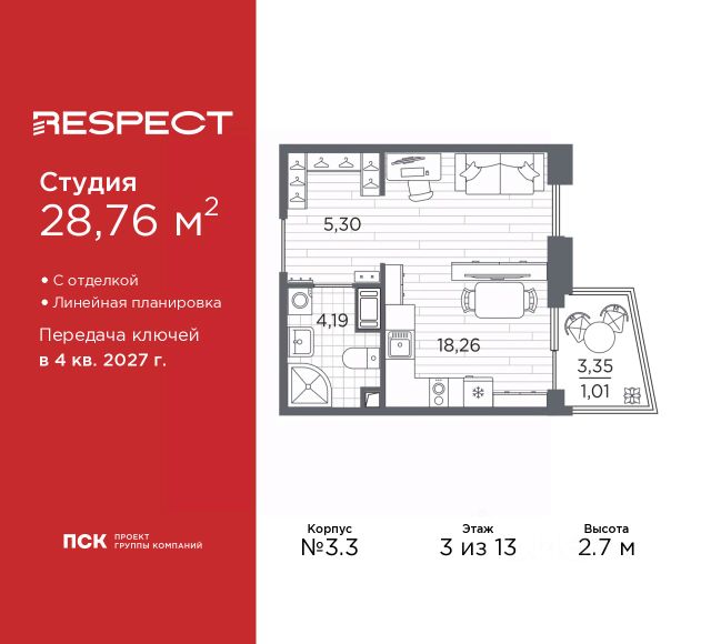 1-комн. квартира-студия от застройщика с отделкой в ЖК "RESPECT" на 3 этаже. Общая площадь: 31.23 кв.м., площадь гостиной 22.81 кв.м., из которых 5 кв.м. выделено под кухонную зону. Все окна выходят на одну сторону. В квартире один балкон, один совмещенный санузел. Высота потолков 2.7 м. Дом монолитный, многоподъездный, переменной этажности, от 8 до 13 этажей. Квартира находится в 1-й секции высотой 13 этажей в корпусе 3.3. На этаже 6 квартир. В подъезде 1 пассажирский и 1 грузовой лифт. Начало строительства - 3 квартал 2025 года. Окончание строительства - 4 квартал 2027 года. Оформление сделки по договору долевого участия. В шаговой доступности от жилого комплекса имеются станции метро (расстояние по прямой): "Лесная" (800 м), "Площадь Мужества" (1.4 км), "Выборгская" (1.9 км), также недалеко от этого корпуса находятся станции метро: "Академическая", "Политехническая". Жилой квартал "RESPECT" строится на Полюстровском пр, 87, в одной из самых востребованных локаций Петербурга. В 10 минутах пешком - метро "Лесная" и в 10 минутах на транспорте - Петроградская сторона. Высота домов от 7 до 13 этажей. Квартиры сдаются с отделкой white box и с чистовой отделкой. На территории Respect строится школа на 1125 учащихся и детский сад на 240 мест. Запроектированы собственная газовая котельная, закрытая территория, дворы без машин и подземные паркинги с лифтами. В проекте предусмотрены трапециевидные балконы или остекленные лоджии, которые, с одной стороны, исключают монотонность фасада, являясь декоративными элементами, с другой дополнительным функциональным пространством в квартирах. Цветовая гармония фасадов каждого дома раскрывает характер квартала. Коричневый цвет клинкерного кирпича со структурой водяных штрихов — цвет уюта и безопасности, сдержанности и надёжности. Вентилируемые фасады облицованы клинкерным кирпичом. Его высокая прочность позволяет давать 100 лет гарантии на этот материал. Водопоглощение клинкерного кирпича составляет менее 5%, за счет чего у него высокая теплопроводность и прочность. В квартале запроектированы внутренние закрытые территории дворов домов без доступа автомобилей и безбарьерная среда для велосипедистов и колясок. Предусмотрены IP-домофония с функцией дистанционного открывания калиток и парадных, а также дистанционный сбор показаний счетчиков и мобильное приложение для жителей. Для безопасности жителей квартала - круглосуточное видеонаблюдение и служба охраны. В каждой квартире предусмотрены внешние корзины для кондиционеров. Вся территория квартала будет связана единой концепцией благоустройства, разработанной ландшафтным бюро L.BURO. На эксплуатируемой кровле на уровне первого этажа в домах 1 и 4 будут обустроены общественные видовые террасы. Это станет не только привлекательным местом с красивым видом, но и удобным, многофункциональным пространством. Дизайн парадных зон и входных групп - сочетание лаконичности отделки и декоративных элементов с текстурами из натурального камня и дерева с пригл Продается квартира-студия в округе Пискарёвка в Санкт-Петербурге.