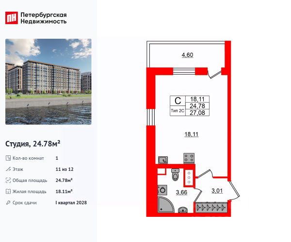 Продается просторная студия от застройщика в жилом комплексе "Сэтл Ривьера" в активно развивающимся Невском районе. До метро можно добраться на транспорте всего за 10 минут. Удобная, классическая, функциональная европланировка, вместительная прихожая 3.01 м². Общая площадь студии - 24.78 м², жилая 18.11 м², высота потолка 2.77 м. Квартира продается с отделкой "Норд Лайн светлый плюс". Что особенного в ЖК "Сэтл Ривьера"? • Первая береговая линия Невы. 5 км до центра Петербурга • "Активити парк" - пространство для занятий спортом и отдыха. "Ривьера парк" с променадом и панорамной ротондой • Масштабные дворы 10 000 кв.м. с авторским ландшафтным дизайном • Двухуровневые единые входные группы • Видовые квартиры с террасами, каминами и саунами