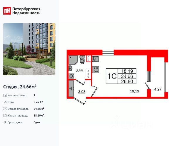 Арт. 125664589 Продается просторная студия общей площадью 27,5 м² в современном ЖК "Граффити" — жилом комплексе с закрытым двором без машин, благоустроенной территорией и детскими площадками.