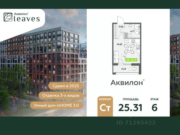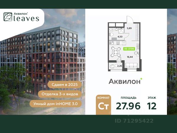 Купи квартиру в ЖК "Аквилон Leaves"! Отделка В квартире выполнена предчистовая отделка WhiteBox +Возможен дозаказ отделки в любом из 3 цветов: SAND, TERRA, GRAPHITE Отделка входит в стоимость квартиры в ДДУ ЖК "Аквилон Leaves" Жилой комплекс класса бизнес-лайт "Аквилон Leaves" воплощает идеальную синергию природы, технологий и дизайна. В одном из самых престижных районов Санкт-Петербурга мы создаем функциональную жилую среду, которая позволит максимально быстро и удобно решать бытовые вопросы, сохраняя ценное время для семьи и любимых занятий. -Малошумные лифты -Сквозные парадные -Светопрозрачные входные группы -Увеличенная высота первого этажа -Безбарьерная среда -Подземный паркинг Стандарты Группы Аквилон для вашей комфортной жизни Thermo-S экономия на коммунальных платежах за счет дополнительно утепленных стен, кровли и цоколя. Энергоэффективные окна с селективным покрытием и аргоновым заполнением Soundstop - дополнительная шумоизоляция внутренних перегородок и межэтажных перекрытий, шумозащитные окна, малошумные лифты Light-in - в квартирах устанавливаются широкоформатные окна, увеличены на 30%. Высота подоконников на уровне 60 см от пола. Vent-in - в каждой комнате есть клапаны индивидуальной вентиляции, которые обеспечивают приток свежего воздуха с улицы. inHOME умный дом в каждой квартире Интеллектуальная цифровая система, которая позволит дистанционно решать бытовые вопросы, управлять квартирой и экономить на оплате коммунальных услуг. В состав inHOME входят: IP-домофон, Face key, "умные" счетчики, датчики протечки, дистанционное отключение розеток, и т.д. Двор ваш личный парк Благоустройство двора от студии ландшафтного дизайна MEGABUDKA отсылает нас к образу зеленого листа. Современная архитектура гармонирует с окружающей средой, а экологические стандарты и "умные" системы обеспечивают ежедневный комфорт. -Зонирование на площадки для активного и спокойного отдыха. -Ландшафт с геопластикой и рельефом напоминает естественную красоту природных парков. -Всесезонные растения -Высаживаются взрослые деревья и кустарники Локация и инфраструктура Помимо разнообразной инфраструктуры, рядом с комплексом расположен Пулковский парк и сад "Дубовая роща". У жителей будут все возможности для отдыха на свежем воздухе. Велопрогулка, пробежка или летний пикник наслаждайтесь природой, не уезжая далеко загород. -10 мин. до м. Московская -15 мин. до м. Звездная -15 мин. до аэропорта Пулково -30 мин. до Невского пр. #ZMEgEl Продам квартиру-студию на улице Среднерогатская в Санкт-Петербурге.
